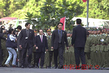 国家主席江泽民二十日在澳门参加回归庆典中,来到刚刚进驻澳门闹市里的解放军军营,检阅未洗征尘的三军将士。 中新社数码传真 毛建军 摄