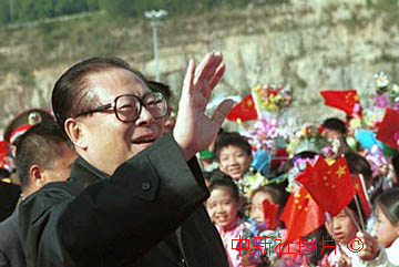 国家主席江泽民完成澳门政权交接盛典后,二十日飞离澳门前向各界人士招手致意。中新社传真 董会峰摄