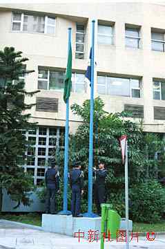 澳门治安警察局举行升旗仪式。拥有四千多名警察的治安警察局是当日零点将原治安警察厅中的“厅”换掉而改为本名的。 中新社传真 曾宪成摄