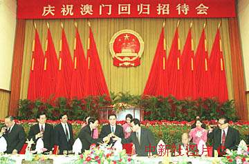 为庆祝澳门顺利回归,二十日下午首都各界人士在北京人民大会堂欢聚一堂,参加国务院举行的庆祝澳门回归招待会。作者:任海霞