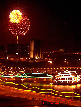 与澳门山水相连的珠海市二十日晚施放烟花庆祝澳门回归,火树银花映红了澳门海滨。 中新社数码传真 贾国荣摄