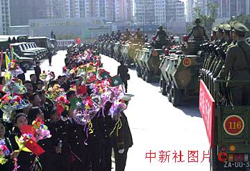 解放军驻澳门部队二十日十二点整前进到珠海与澳门相连的关闸,开始进驻澳门,受到珠海军民的热烈欢送。中新社数码传真 王瑶摄