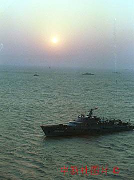 澳门回归中国第一个日出海上红日高照,映照在海边担负保卫的舰艇。 中新社传真 贾国荣摄