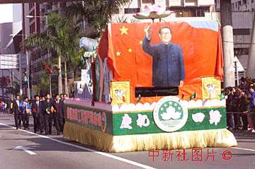 澳门回归之日在闹市举行盛大的“迈向美好明天"大巡游中,国家主席江泽民挥手形象的花车最引人注目。中新社数码传真 宗金柱摄