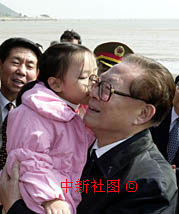 国家主席江泽民21日上午在澳门黑沙滩与澳门小姑娘在一起。中新社/澳新局传真