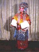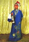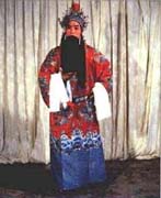 长袍类 一、蟒:也称龙袍、蟒袍,是帝、王、将、相在朝贺宴会或办公事的时候所穿的礼服。 蟒的样式是圆领、大襟、长度一般拖到脚面,袖子宽阔、肥大,带水袖,配有宽松的腰带。 这是戏曲舞台上扮演帝王、官员等角色使用量最多的一种蟒袍,扮演文臣武将的老生、小生、武生都可使用。在戏曲舞台上,常由蟒袍的色彩来区别剧中任的身份、地位与年龄。蟒袍大体分为红、明黄、杏黄、白、蓝、绿、紫、粉红、淡湖、浅米、古铜、豆沙、香色等。原箱蟒袍分为上、下五色,上五色是红、绿、黄、白、黑色;下五色是蓝、紫、粉红、淡青和香色。明黄与杏黄是扮演皇帝、番王、王子以及齐天大圣(孙悟空)的蟒袍专用色,其他角色不得使用。 蟒的图案主要是龙形图案。十团龙蟒袍在绣工上大体分为彩绣、墨绣、平金漏地绣、满金绣、半金半彩绣、裹金绣(一金线、一彩线混合绣)等。绣法各异,色彩纷呈。不同的绣工处理与十团龙图案相配合,使得十团龙蟒袍造型庄重、文雅、气派。 穿用十团龙蟒袍的有《甘露寺》中的刘备(因是汉中山靖王刘胜之后,汉景帝之玄孙,过江招亲时,穿红色十团龙袍)、《秦香莲》中的陈世美(因考中状元,被招为东床驸马后,穿十团龙红色蟒袍)、《玉堂春》中的王金龙(因中头名状元,并被封为八府巡按,当他会同藩司、臬司三堂会审旧时情人苏三(玉堂春)时,穿十团龙红色蟒袍)。 而平金绣散龙黑色蟒袍则是戏曲舞台上扮演花脸行当的文臣、武将的官服或朝服。舞台上常见的散龙蟒袍有黑、蓝、紫、绿、杏黄等色。 散龙图案式样繁多,其造型比团龙活泼、豪放。如散坐龙、散升龙、散降龙、倒挂龙、喷水龙、串水龙、串云龙、回头龙、教子升天龙(一大龙、一小龙)、戏珠升降龙等等,均是散龙大蟒袍常用的图案。 制作时以平金绣为主,稍加彩绣为装饰色,配合腾云飞舞的散龙图案,及大面积金海水为下摆(海水江芽),其造型格外庄重辉煌。 穿用人物有《秦香莲》中的包文正(包公)、《霸王别姬》中的项羽(在出征前,除名演员穿黄色蟒袍外,一般都穿黑色散龙大蟒袍)等。 在戏曲舞台上扮演地位较高而又到苍老年龄的文职官员,其穿用的朝服有裹金绣香色蟒袍。因为专为老年官员穿用,所以力求色彩沉稳,但又不失辉煌效果。制法上采用一线一金的"裹金绣",绣制团龙图案。穿用人物有《甘露寺》中的乔玄、《秦香莲》中的王延龄等。 而彩绣豆沙色蟒袍则适合舞台上扮演地位较高,而又不到苍老年龄的文职官员穿用。制作时要求色彩文雅,采用团龙图案,用雅彩裹金绣绣制海水江芽。穿用人物如《将相和》中的蔺相如。 彩绣红色女蟒袍一般为戏曲舞台上扮演皇后、贵妃、公主、诰命夫人(受皇帝册封的贵妇)及挂帅女将等的朝服和公服。有时也当作世宦人家结婚时的礼服。以红色为主,分为彩绣与平金绣两种。花纹多用团凤、散凤和牡丹等,也可龙凤并用。蟒袍下摆绣有"海水江芽"。女蟒袍有老式和新式两种式样。老式女蟒袍,外缘加宽边;新式女蟒袍形同男蟒袍,不加外边缘。色彩要求艳丽、辉煌,体现出人物的雍容华贵。 穿用人物有《贵妃醉酒》中的杨玉环(身着红色女蟒袍到百花亭侯驾)、《大登殿》中的王宝钏(身穿红色女蟒袍上朝见君受封为昭阳正宫娘娘)。 老旦蟒袍多为戏曲舞台上扮演皇太后和地位较高的诰命老夫人穿用的朝服或公服, 穿用人物有《太君辞朝》中的佘太君、《甘露寺》中孙权之母吴氏。 在戏曲舞台上扮演番邦后妃、公主等的朝服,一般称为女旗蟒袍。以红色地为主,分彩绣与平金绣两种,用团龙、团凤和龙凤等图案。清朝服装的女旗蟒袍不用"护领",用湖色硬翻领(类似现代衬衣硬领)(领衣),蟒袍下摆海水无开起,旗蟒身长以不露鞋为标准。 穿用人物有《四郎探母》中的铁镜公主(朝见萧太后穿朝服女旗蟒袍)、《大登殿》中的代战公主(上殿朝驾时穿朝服旗蟒)。 蟒中还派生出两种袍服:一种是官衣,一种是宫衣。 1.官衣:是一般文职官员穿用的礼服。式样同蟒。图案是在胸前和背后绣一块方形的图案,官衣的色彩有红、蓝、紫、黑、古铜等。 官衣多为戏曲舞台上扮演新科状元、榜眼、探花等角色临时的官服。待任命官职之后再按品级穿官服。官衣,还可作为七品县官和新婚典礼中新郎官的吉服。 官衣颜色多为红色、蓝色、紫色、黑色和白色。黑色官衣品级最低,多为驿丞(驿站站长)、门官等穿用,不缀补子。白色为国丧孝服(不常用)。它的造型基本上是明代官服的原样,只是加以艺术的美化和提高。 明代官衣不用素地,多用暗纹云锦织成衣料,而舞台上大部分用素地(因云锦造价太高)。 明代官服补子(官员品级标志)多在衣服的前胸、后背部直接绣成,而清代官服品级标志是先绣成补子,然后再缀到天青色褂子上。 穿用人物有《御碑亭》中的王有道和柳生春(在"拜恩师"一场中,二人同穿大红官衣)、《马前泼水》中的朱买臣(中了状元后,夸官游街时身穿大红官衣)等。 女官衣多是戏曲舞台上扮演老年诰命夫人(一品官的妻子)和女官的官服,颜色多为酱紫、古铜、香色等。女官衣在解放前的舞台上使用较多,因那时的演出团体经济条件较差,常用各种色彩的补子女官衣替代老旦蟒袍。解放后,国家对京剧艺术给予极大扶持,设计人员可按人物需要设计服装,其中老旦蟒袍的种类越来越多,原来的老旦补子官衣