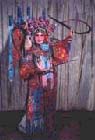 铠甲类 古代作战时,战士穿的铠甲,在京剧舞台上叫靠,是一种美化了的舞蹈服装。靠是用和色的素缎子制成的,上面用金、银彩线绣满鳞甲,看上去辉煌夺目。 靠分男靠、女靠。 男靠式样是分前后两扇披在肩上,还有护领、护肩、下甲、吊鱼、靠肚子以及收紧的瘦袖。 女靠上身与男靠形式差不多,下身缀着五色绣花的飘带,并在靠里衬着裙子,但在开打时,里面也不裙子。 靠一般分硬靠、软靠和改良靠三种, 穿用人物有《霸王别姬》中的项羽(穿平金黑靠)、《古城会》中的关羽(穿平金绿靠)、《挑滑车》中的岳飞(穿白靠)、高宠(穿蓝靠)、《连环计》中的吕布(穿粉靠)、《破洪州》中的杨宗保(穿淡湖靠)等。 戏曲舞台上扮演女将、女统帅的战服多采用女大靠。戏剧中使用的大靠与古代生活中的甲胄并不一样。随着戏曲艺术的发展,大靠的式样和色彩逐渐增多,但距生活服装也越来越远。它纯属为了适应舞台表演的需要而设计。 建国前女大靠种类较少,只有梅兰芳演出《穆柯寨》"花厅招亲"一场戏穿用"玻璃肚子"(用玻璃棍装饰的改良靠)。建国后女靠样式逐渐增多,色彩不断丰富。戏曲服装中,女靠比男靠样式多,而男靠比女靠色彩丰富,女靠只有粉红、大红、淡湖等色。新编历史剧《杨门女将》出台之后,出现了女白靠、黑靠、雪青靠、米黄靠等。 穿用人物有新编历史剧《三请樊梨花》中的樊梨花、 软靠:背后不插靠旗。一般是老年体弱的老将穿用。 改良靠:样式与软靠近似,只要腰身既紧又瘦,几乎就象用腰带系在身上。有的绣鳞甲,有的绣些花纹或镶上一些镀镍的金属凸片或看着晶光闪亮象圆钉子形的装饰。 戏曲舞台上扮演番将、武将群众或新编历史剧中常用改良靠。穿用人物有《雏凤排空》中的番将韩昌、《三打陶三春》的郑子明、《闹龙宫》中的龙子等。 铠是戏曲舞台上扮演皇家殿前御林军、随驾仪仗队或军中统帅的服装,又称大铠。色彩以红为主,多绣平金几何图形纹样。它的造型与生活中的甲胄相似。可见它是以古代生活服装为依据的,只是做法不一。生活服装有铜钉(有的镀金)固定在衣服上,而舞台上的大铠以平金绣为主。这种穿大铠的武士在舞台上只是摆排场,壮声势,没有武打动作。